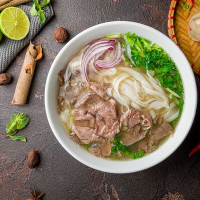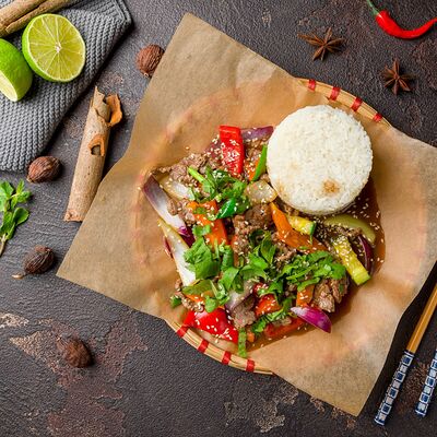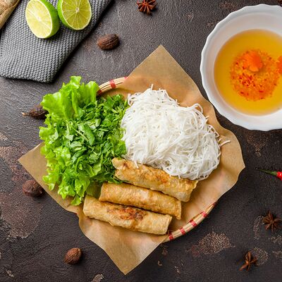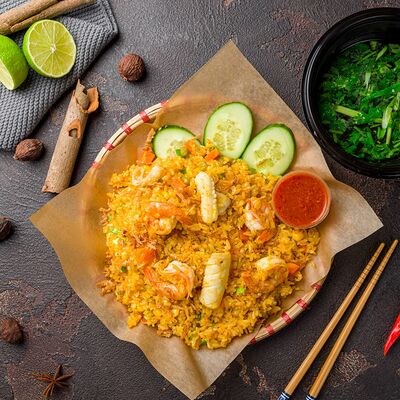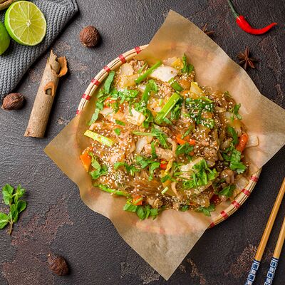 Фунчоза, зеленый лук, репчатый лук, морковь, ростки бобов, древесные грибы, грибы шиитаке, китайский салат, яйца, на выбор: курица, говядина или морепродукты