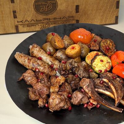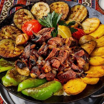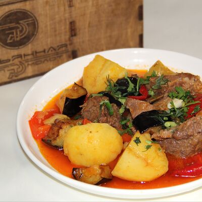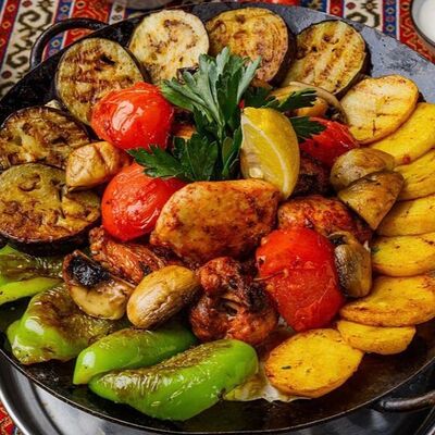Курица, лук репчатый, помидоры, баклажаны, перец болгарский, картофель, зелень, шампиньоны, лаваш