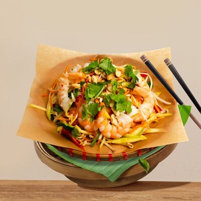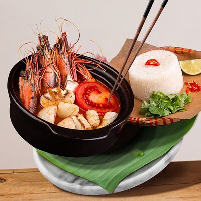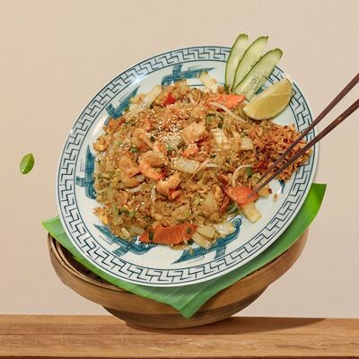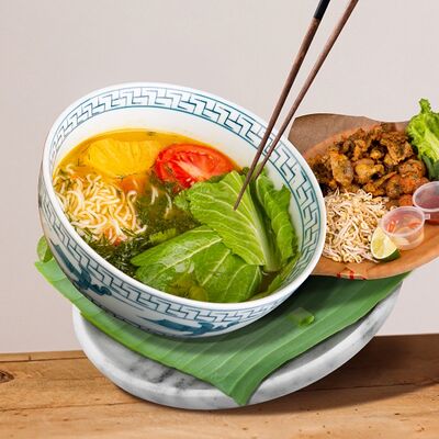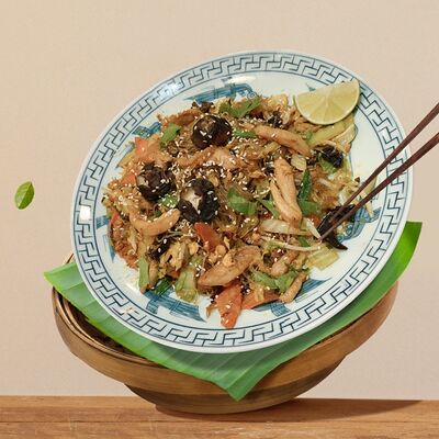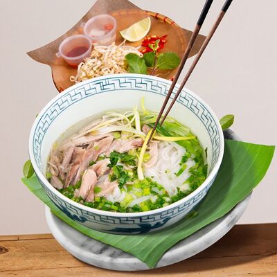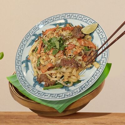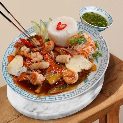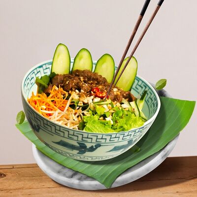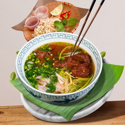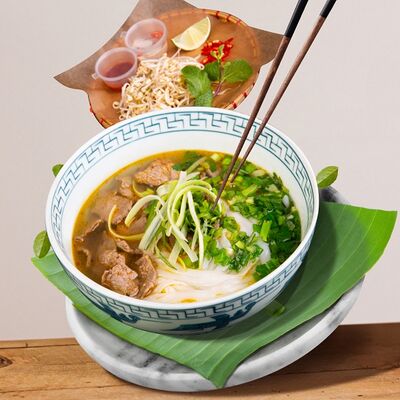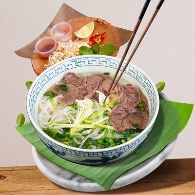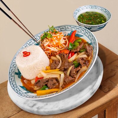 Паровой рис, говядина, соус из черного перца, лук, болгарский перец, вьетнамский салат, кунжут. Подается с чашкой горячего бульона