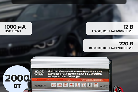 Автомобильный адаптер (инвертер) 12/220V AVS IN-2000W позволяет владельцам автомобилей в дорожных условиях сделать возможной работу бытовой аудио-видео техники, компьютера, ноутбука и прочей оргтехники.Встроенная схема защиты предохраняет устройство от преждевременного выхода из строя в случаях низкого или высокого входного напряжения, неправильной полярности, короткого замыкания во входных цепях питания подключаемого устройства.Характеристики:• Входное напряжение: 12В.• Выходное напряжение: 220В.• Выходная частота: 50Гц.• Номинальная мощность: 2000Вт.• Допустимая пиковая мощность: 4000Вт.• Размеры: 35 х 20 х 7 см.• Защита от короткого замыкания.• Защита от перегрева.