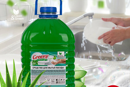Средство для мытья посуды "Greeny" Light Алоэ вера легко очищает посуду благодаря хорошим моющим свойствам. Образует пышную пену, которой хватает для мытья большого объема кухонного инвентаря. Эффективно очищает сложные загрязнения, расщепляет жир и удаляет налет от чая и кофе, даже в холодной воде. Полностью смывается с обрабатываемой поверхности, не оставляя разводов. Входящие в состав увлажняющие компоненты помогают сохранить кожу рук мягкой и нежной. Подходит для очищения всех видов посуды, рабочих поверхностей столов, керамической плитки, столовых приборов из стекла, хрусталя, пластика, фарфора. Приятный аромат «алоэ вера».Способ применения: Мытье вручную: нанести небольшое количество средства на влажную губку, вспенить, вымыть посуду пенным составом, затем смыть проточной водой. Мытье погружением: средство развести водой из расчета 5-10 г на 1 литр воды, опустить посуду в емкость с раствором, потереть губкой, затем тщательно ополоснуть в чистой воде. При необходимости концентрацию можно увеличить.Меры предосторожности: Не принимать внутрь! Избегать попадания в глаза! При работе использовать средства индивидуальной защиты. При попадании на слизистые оболочки промыть большим количеством проточной воды. При необходимости обратиться к врачу. Использовать по назначению. Беречь от детей.Аромат: "алоэ вера"Значение pH: 7Объем: 5 л