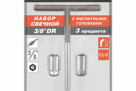 Набор свечной с магнитными головками.2 головки: 16 мм и 21 ммПосадочный размер: 3/8” DRКоличество граней: 6Закалены до твердости 45-48HRCТ-образная прорезиненная рукояткаДлина рукоятки — 20,5 смМатериал - хромованадиевая стальСатиновое покрытиеВ комплект входит три предмета: две магнитные головки 16 и 21 мм., т - образная рукоятка.