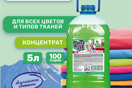 Концентрированный гель для стирки цветных вещей «Soft Gel Color». Идеально подходит для повседневной стирки одежды и белья из всех видов цветных тканей в автоматических стиральных машинах и вручную. Сбалансированный состав средства с содержанием высокоэффективных натуральных компонентов (энзимы) обеспечивает мягкое моющее воздействие, справляясь с загрязнениями различного типа в воде любой жесткости. Специальный цвето сберегающий комплекс в составе геля способствует сохранению яркости красок цветных и темных вещей даже после многократных стирок. Быстро растворяется и легко выполаскивается, не оставляя следов. Придает вещам свежесть и легкий приятный аромат.Способ применения: Важно! Для выбора способа стирки и температуры воды необходимо следовать рекомендациям на ярлыках изделий. Изделия из тканей с неустойчивыми красителями следует стирать отдельно.Автоматическая стирка: 50 мл средства залить в специально предназначенное отделение для основной стирки. При жесткой воде и сильных загрязнениях расход увеличить до 100 мл.Ручная стирка: 50-80 мл средства на 10 л воды , в зависимости от степени загрязнения. Для удаления трудных пятен нанесите гель непосредственно на пятно перед стиркойУсловия хранения: Рекомендуется хранить в сухом, хорошо проветриваемом помещении на расстоянии не менее 1 м от нагревательных приборов, при температуре от +5°С до +35°С. Избегать попадания прямых солнечных лучей и замораживания. Хранить в плотно закрытой упаковке отдельно от пищевых продуктов.Меры предосторожности: Осторожно! При попадании в глаза вызывает раздражение. В случае попадания в глаза промыть большим количеством проточной воды. При необходимости обратиться за медицинской помощью. Использовать только по назначению. Беречь от детей. При повышенной чувствительности и повреждениях кожи избегать контакта с любыми средствами для стирки. При ручной стирке использовать перчатки.Срок годности – 2 годаКоличество стирок: 100 стирок.Объем: 5 л.
