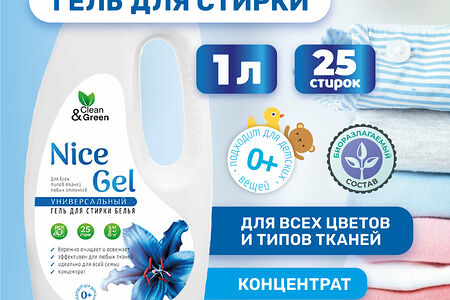 Универсальный концентрированный гель для стирки «Nice Gel». Разработан для повседневной стирки одежды и белья из всех видов тканей любых оттенков в автоматических стиральных машинах и вручную. Специальная сбалансированная формула средства с содержанием высокоэффективных натуральных компонентов (энзимы) обеспечивает мягкое моющее воздействие, справляясь с загрязнениями различного типа в воде любой жесткости. Быстро растворяется и легко выполаскивается, не оставляя следов. Сохраняет внешний вид и цвет изделий даже после многократных стирок. Придает вещам свежесть и легкий приятный аромат. Не содержит фосфатов, отбеливателей и хлора.Способ применения: Важно! Для выбора способа стирки и температуры воды необходимо следовать рекомендациям на ярлыках изделий. Изделия из тканей с неустойчивыми красителями следует стирать отдельно.Автоматическая стирка: 40 мл средства залить в специально предназначенное отделение для основной стирки. При жесткой воде и сильных загрязнениях расход увеличить до 100 мл.Ручная стирка: 50-80 мл средства на 10 л воды, в зависимости от степени загрязнения. Для удаления трудных пятен нанесите гель непосредственно на пятно перед стиркой.Меры предосторожности: Осторожно! При попадании в глаза вызывает раздражение. В случае попадания в глаза промыть большим количеством проточной воды. При необходимости обратиться за медицинской помощью. Использовать только по назначению. Беречь от детей. При повышенной чувствительности и повреждениях кожи избегать контакта с любыми средствами для стирки. При ручной стирке использовать перчатки. Условия транспортировки и хранения: Рекомендуется хранить в сухом, хорошо проветриваемом помещении на расстоянии не менее 1 м от нагревательных приборов, при температуре от +5°С до +35°С. Избегать попадания прямых солнечных лучей и замораживания. Хранить в плотно закрытой упаковке отдельно от пищевых продуктов. Срок годности: 2 года.Количество стирок: 25 стирок.Объем: 1000 мл.