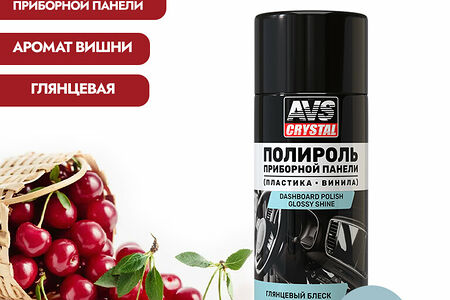 Входящие в состав специальные компоненты очищают обрабатываемую поверхность и восстанавливают первоначальный цвет. Силиконовые полимеры придают поверхности глянцевый блеск, защищают от старения и растрескивания. Образуемая защитная пленка обладает антистатическим эффектом, препятствует оседанию пыли. Защищает от ультрафиолета. Длительный срок действия. После нанесения средство не оставляет разводов и жирных следов. Обладает приятным ароматом "ваниль", нейтрализуя неприятные запахи, в том числе запах табака.Способ применения: Использовать при температуре не ниже +10°С. Перед использованием энергично встряхнуть баллон. Нанести полироль тонким слоем на обрабатываемую поверхность и не дожидаясь высыхания, отполировать мягкой тканью. Внимание! Не использовать под воздействием прямых солнечных лучей и на горячей поверхности. Не использовать на руле, рычаге ручного тормоза, на педалях - они могут стать скользкими, что может привести к потере управляемости автомобилем.Условия транспортировки и хранения: Рекомендуется хранить в хорошо проветриваемом сухом помещении на расстоянии не менее 1 м от нагревательных приборов, при температуре от +5°С до +25°С. Не допускать сдавливания баллона, следить за сохранением целостности упаковки. Беречь от воздействия солнечных лучей и атмосферных осадков.Меры предосторожности: ОГНЕОПАСНО! Содержимое под давлением! Предохранять от воздействия прямых солнечных лучей, воздействия статического электричества и нагревания свыше +50°С. Не распылять вблизи открытого огня и раскаленных предметов! Не курить во время пользования! Не разбирать и не давать детям! Не вдыхать испарения, избегать попадания внутрь, на открытые участки кожи и в глаза. При попадании на кожу или в глаза, обильно промыть чистой водой. При необходимости обратиться за медицинской помощью. Использовать только по назначению. Использованный баллон не сжигать, утилизировать как бытовой отход.Тип: аэрозольОбъем: 520 млАромат: вишня