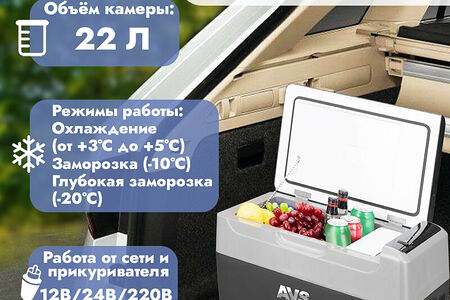 Автохолодильник AVS FR-22G предназначен для охлаждения и глубокой заморозки продуктов питания, а также для поддержания их в этом состоянии. Автохолодильник может использоваться в легковых и грузовых автомобилях, автодомах,специальной технике, лодках, катерах, яхтах. Благодаря наличию адаптера 220 В автохолодильник можно использовать дома, в офисе, гостинице.Охлаждение (от +3°С до +5°С)Заморозка (-10°С)Глубокая заморозка (-20°С)Автоматическое поддержание заданной температурыЗащита от разрядки автомобильной аккумуляторной батареиМногофункциональный электронный дисплей с цифровым отображением текущей и установочной температуры и отображением напряжения бортовой сетиИндикация температуры в градусах Цельсия и ФаренгейтаКомпрессор с увеличенным сроком службы (устойчивый к наклонам и вибрациям)Защищенный испарительБеспроводное управление с телефона, с помощью приложенияВ соответствии с проводимой политикой постоянного усовершенствования технических характеристик и дизайна, возможно внесение изменений без предварительного уведомления.Товар сертифицирован в соответствии с действующим законодательством.Прибор собран из современных и безопасных материалов.По окончании срока службы, во избежание возможного причинения вреда жизни, здоровью потребителя, его имуществу или окружающей среде, прибор должен быть утилизирован отдельно от бытовых отходов в соответствии с правилами по утилизации отходов в вашем регионе.Входное напряжение: 12/24/220 ВольтНоминальный ток: 3.75/1.875 АмперНоминальная мощность: 60 ВаттДиапазон регулировочных температур: От +20°С до -20°СОбъём холодильной камеры: 22 литраГабаритный размер: 598 х 320 х 335 ммРазмер упаковки: 615 х 390 х 365 ммРазмеры холодильной камеры: 244 х 326 х 254 ммХладагент: R134aПредохранитель: 15 АЗащитное отключение: ДаАвтоматическое поддержание заданной температуры: ДаЭлектромагнитная совместимость: ДаПодключение через прикуриватель: ДаИзоляция: Полиуретановая пенаМаксимальный угол наклона компрессора: 40°Вес нетто: 11 кгКомплектация: автохолодильник, форма для льда, кабель питания 12/24 В, адаптер питания 220 В, инструкция по эксплуатации, гарантийный талон.