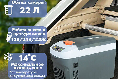 Автомобильный холодильник AVS CC-22WAC удобно использовать не только в автомобиле, а также и на даче, на природе! Помимо подключения к бортовой сети авто 12/24В, холодильник имеет разъем для подключения к 220 В бытовой сети. Удобный ремень для переноски, простота и удобство в эксплуатации.Удобная форма и легкий вес. Дополнительный ЭКО режим с бесшумной работой и сниженным энергопотреблением.Характеристики:• Питание: 12/24/220 В.• Мощность в режиме охлаждения: 80 Вт.• Мощность в режиме нагрева: 65 Вт.• Емкость: 22 л.• Размер упаковки: 390*280*545 мм.• Внешний размер (без упаковки): 370*276*500 мм.• Размер холодильной камеры: 292*212*345 мм.• Вес: 5,3 кг.• Работает по принципу эффекта Пельтье.• Максимальное охлаждение: 22-25 С от температуры окружающей среды.• Минимальная температура: -2 С (при температуре окружающей среды не выше +23 С и непрерывной работе не менее 3-х часов).• Максимальный нагрев: +65 С.• LED дисплей.Материал: пластик.