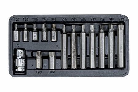 Набор вставок TORX (T20 - T55) от AVS - это высококачественный набор инструментов для работы с крепежом. Он включает в себя 15 бит с шлицами Torx с отверстием, которые подходят для работы как с мелким, так и крупным крепежом, что делает его универсальным набором инструмента. Биты выполнены из хромованадиевой стали (CrV) с твердостью 48 - 52 HRC, что обеспечивает высокую прочность и долговечность инструмента.Состав набора:• Вставка TORX 30 мм с отверстием: T20, T25, T30, T40, T45, T50, T55• Вставка TORX 75 мм с отверстием: T20, T25, T30, T40, T45, T50, T55• Держатель вставки: F1/2"DR*F3/8"HEX• Пластиковый кейсНабор оснащен пластиковым кейсом для хранения, который легко помещается в сумку или ящик для инструментов. Это делает его удобным для использования как в мастерской, так и на выезде. Кроме того, набор оснащен держателем для бит, который позволяет легко и быстро менять насадки.Преимущества набора вставок TORX от AVS:- Высокая прочность и долговечность благодаря использованию хромованадиевой стали;- Набор включает в себя все необходимые биты для работы с крепежом;- Удобный пластиковый кейс для хранения и переноски;- Держатель для бит позволяет быстро и легко менять насадки;- Подходит для работы как в мастерской, так и на выездных работах.Если вы ищете надежный и удобный набор инструментов для работы с крепежом, то набор вставок TORX AVS с отверстием - идеальный выбор. Он поможет вам быстро и качественно выполнить работу, а также сэкономит время и деньги на покупку отдельных бит.