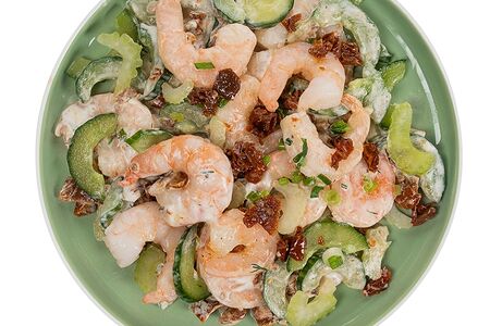 Салат с креветками, вяленым томатом и йогуртовой заправкой от бренд-шефа АВ доставка