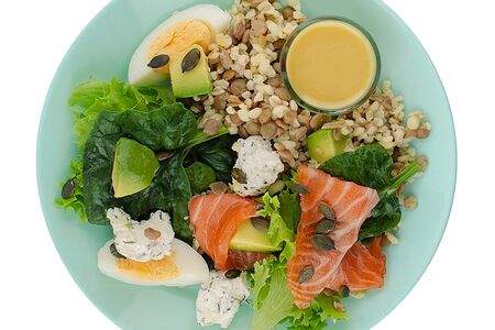 Салат с авокадо, домашним творогом и слабосоленым лососем в имбирно-медовой заправке Уже Готово доставка