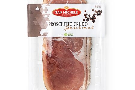 Окорок свиной сыровяленый «Прошутто крудо» с чёрным перцем, San Michele, 70 г, нарезка, Италия доставка