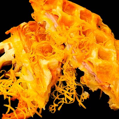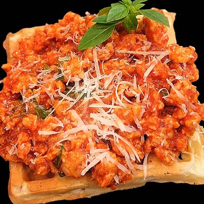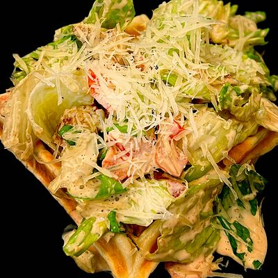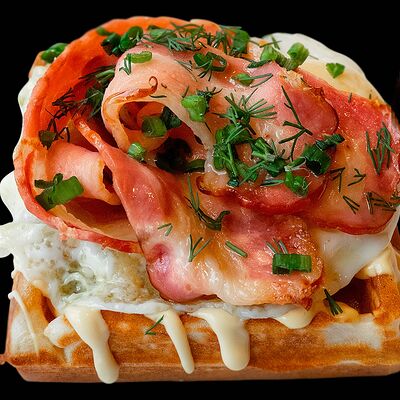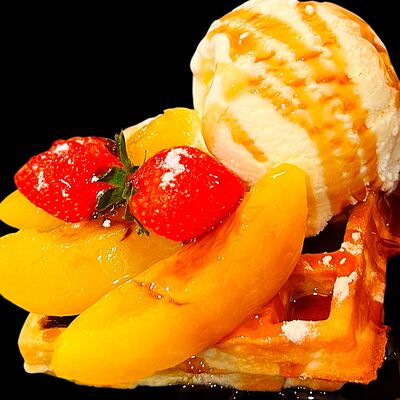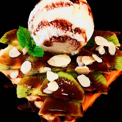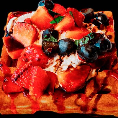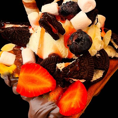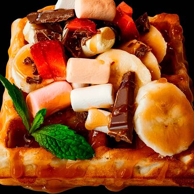 Вафли сладкие, банан, клубника, шоколад, топпинг карамель, маршмэллоу (1 шт.)