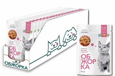 Корм для котят ОБЖОРКА от 1 до 12 мес., кусочки в соусе с мясным ассорти пауч 85г (упаковка - 24 шт) доставка