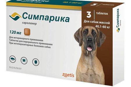 Таблетки для собак ZOETIS Симпарика от блох и клещей (40-60кг) 120мг, 3 таб на 105 дн. доставка