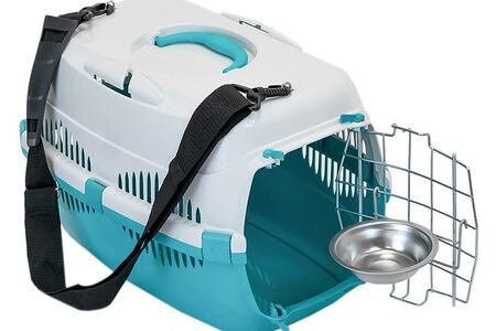 Переноска для животных FOXIE 44х29х27,5см с металлической дверцей, ремнем и миской бирюзовая (до 9кг) доставка