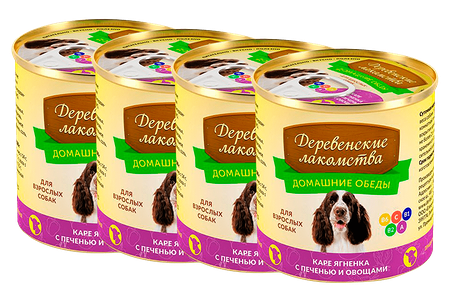 Корм для собак ДЕРЕВЕНСКИЕ ЛАКОМСТВА Домашние обеды Каре ягненка, печень, овощи конс.240г (упаковка - 4 шт) доставка