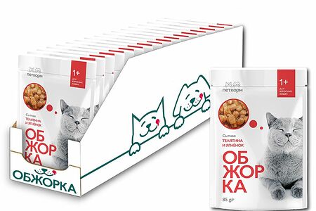 Корм для кошек ОБЖОРКА кусочки в желе с телятиной и ягнёнком пауч 85г (упаковка - 24 шт) доставка