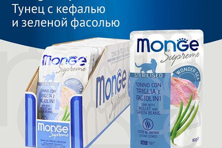 Корм для кошек MONGE Supreme Pouch для стерилизованных, тунец с кефалью и зелёной фасолью пауч 80г (упаковка - 24 шт) доставка