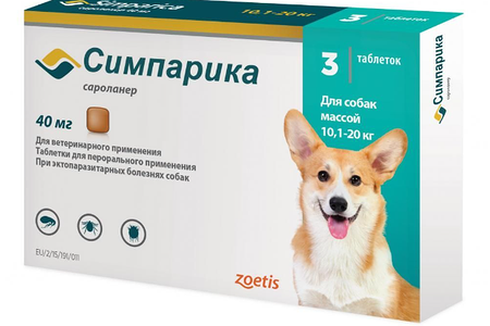Симпарика таблетки от блох и клещей для собак 10,1-20кг, 40мг 3 таб доставка