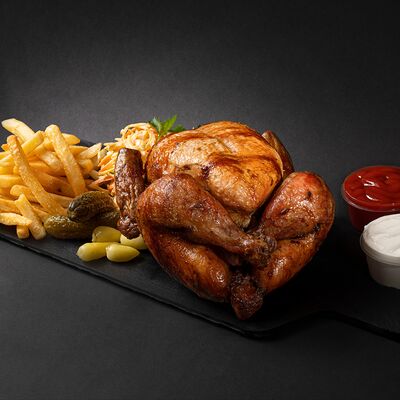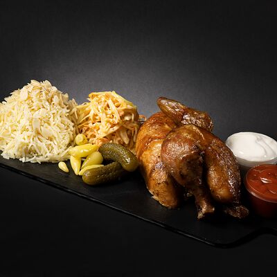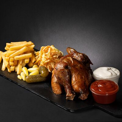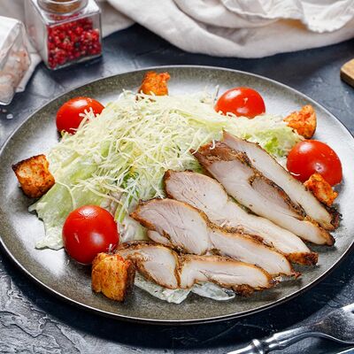 Салат из свежих овощей, картофель фри, мясо гриль-грудка, соус, морс собственного производства