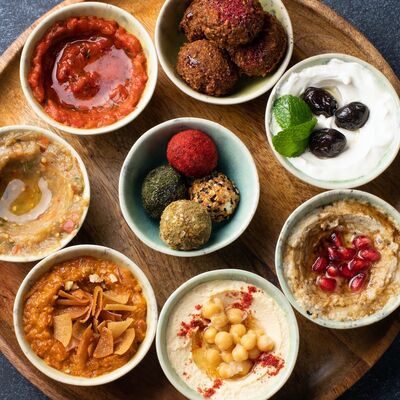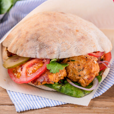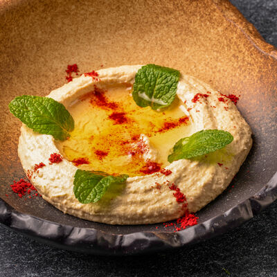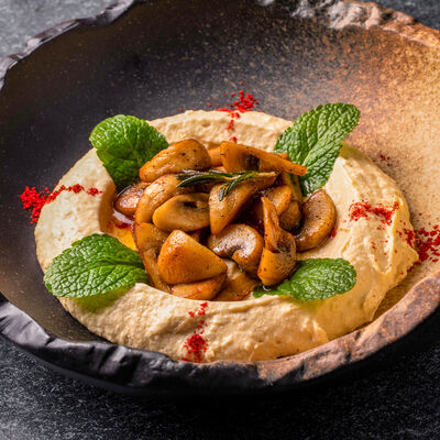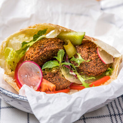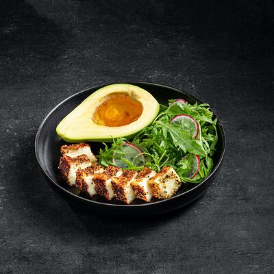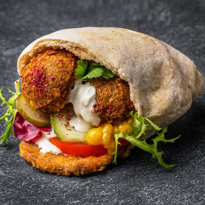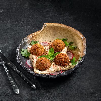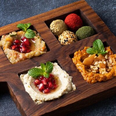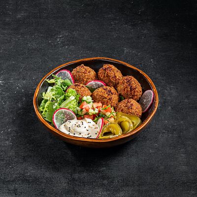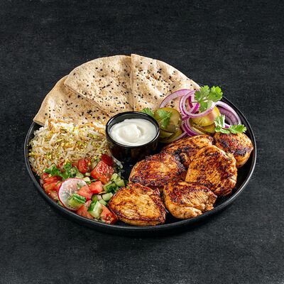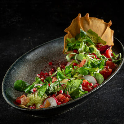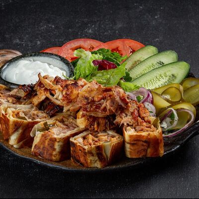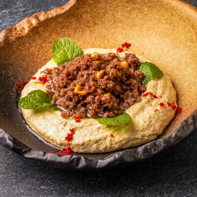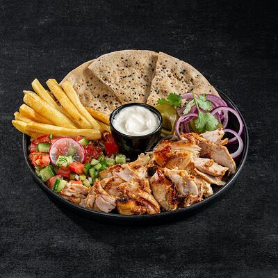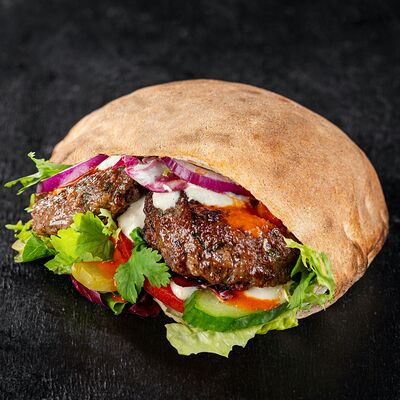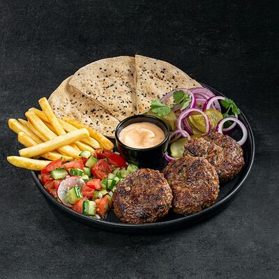 Котлеты из мраморной говядины Prime Beef с картошкой фри, салатом Израиле, огурцами, луком и соусом спайси