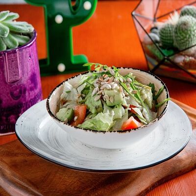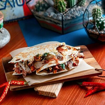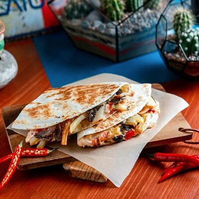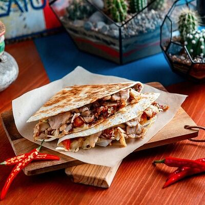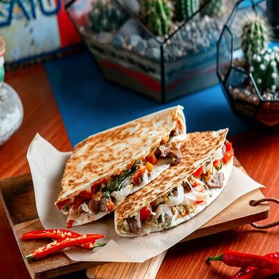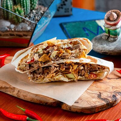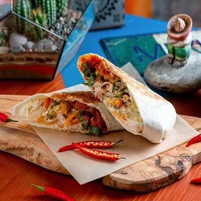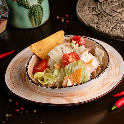 Тортилья, говядина, свинина, курица, салат айсберг, помидоры, салат, сыр, кукурузная лепешка, соус тамариндовый и сливочный