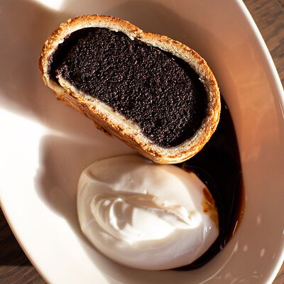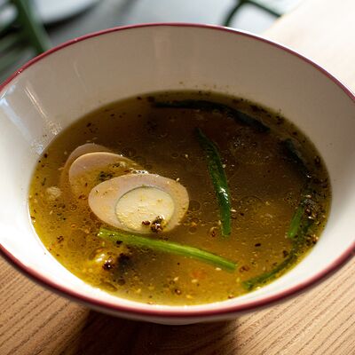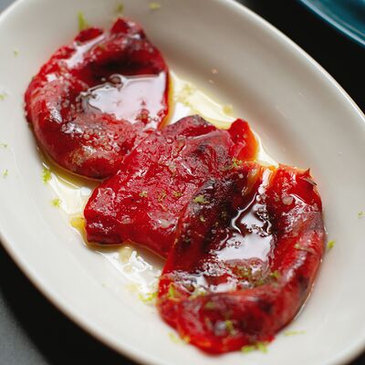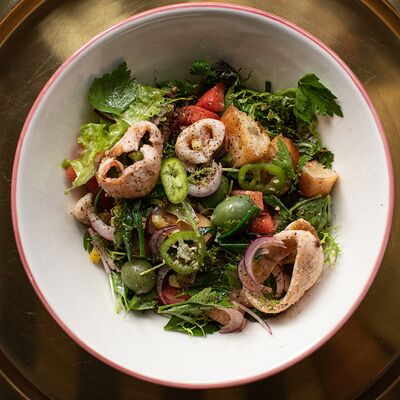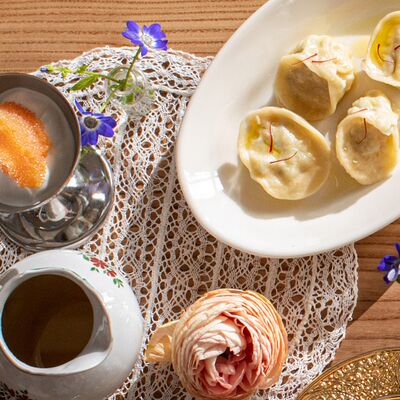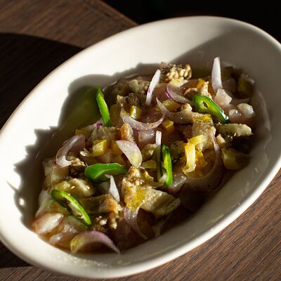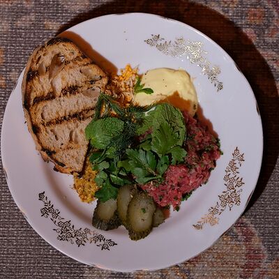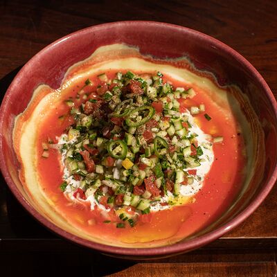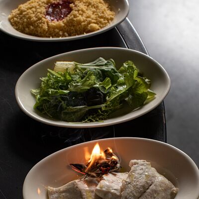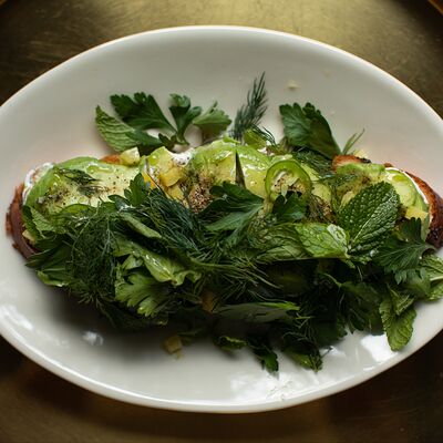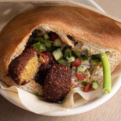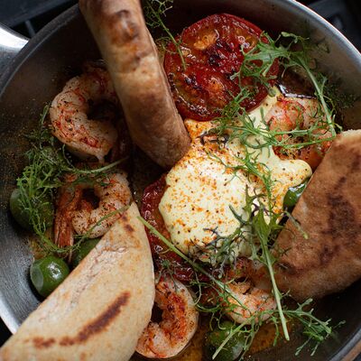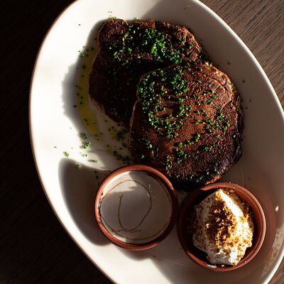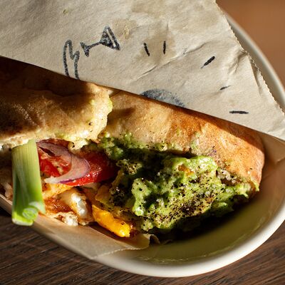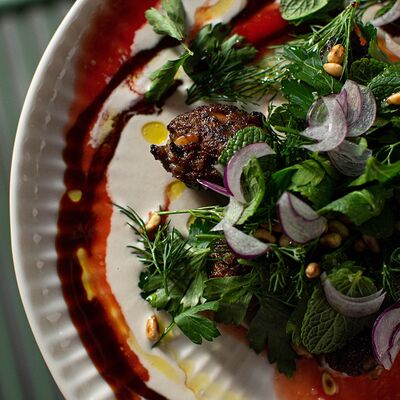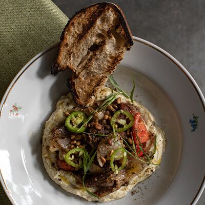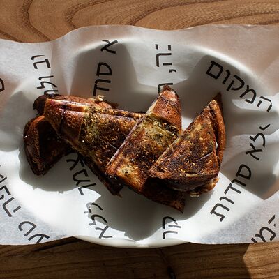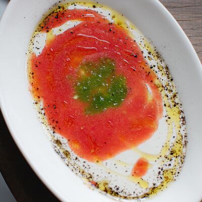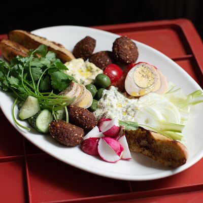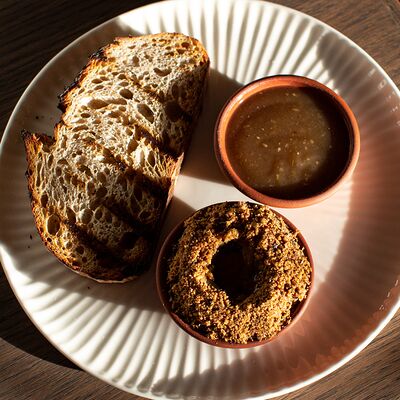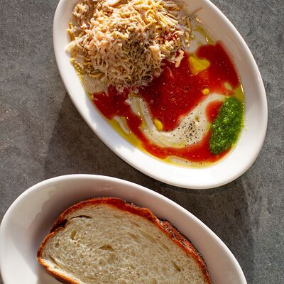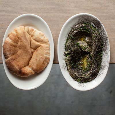 Хумус, соус схуг, тертые узбекские томаты, яйцо отварное, масло оливковое, сладкий хлеб