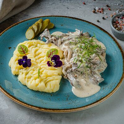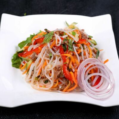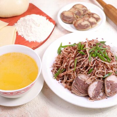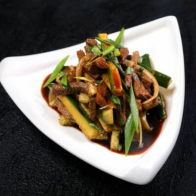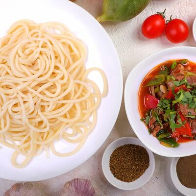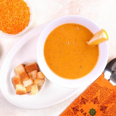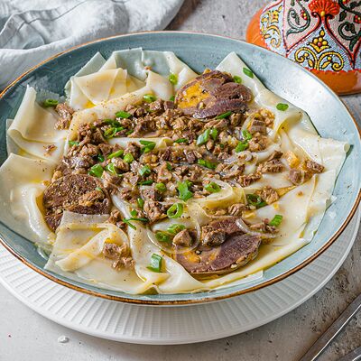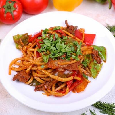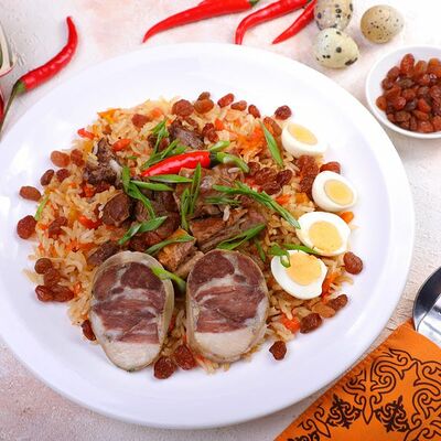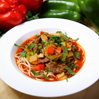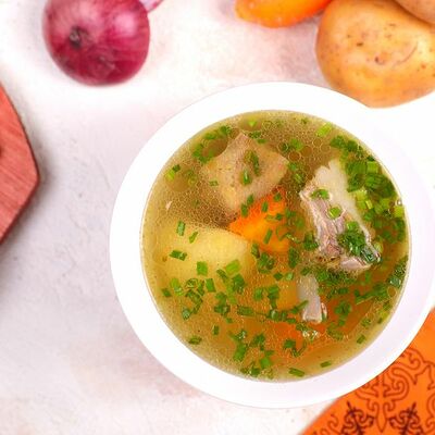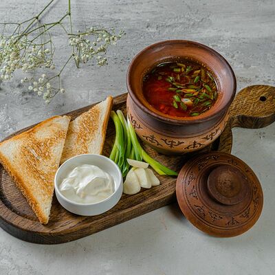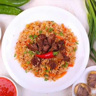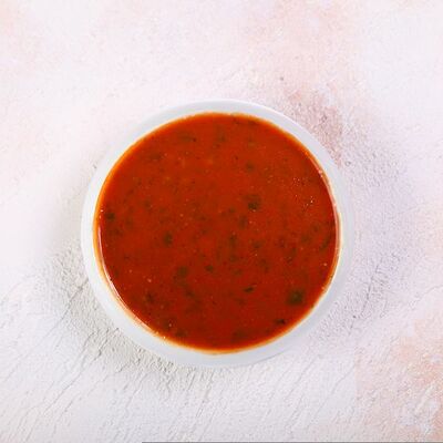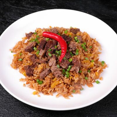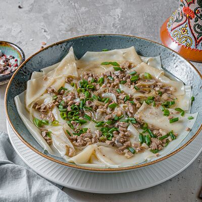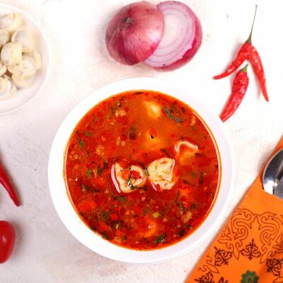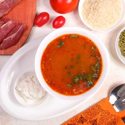 Национальный насыщенный узбекский суп на пикантном красном бульоне с мелко рубленной говядиной, рисом и бобами маш. Подаётся с подсоленным кисло-молочным соусом