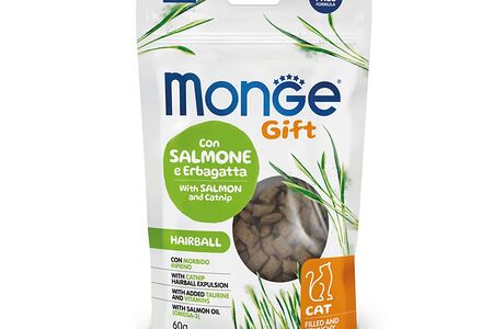 Лакомство для кошек Monge Gift Hairball Хрустящие подушечки с начинкой Лосось и кошачья мята для вывода шерсти доставка