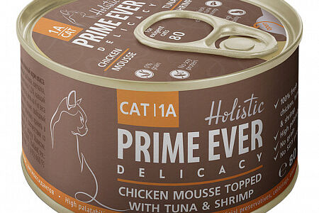 Консервы для кошек Prime Ever 1A Delicacy Мусс цыпленок с тунцом и креветками доставка