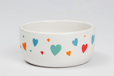 Миска керамическая для кошек и собак, 11x5,5 см, белая c рисунком кошки с сердцами доставка