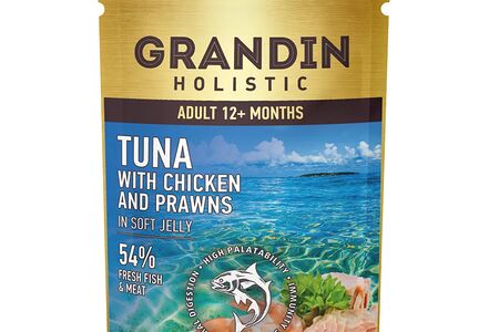 Влажный корм Grandin для взрослых кошек, тунец с курицей и креветками в нежном желе, 85 гр. доставка