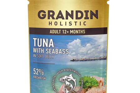 Влажный корм Grandin для взрослых кошек, тунец с морским окунем в нежном в желе, 85 гр. доставка