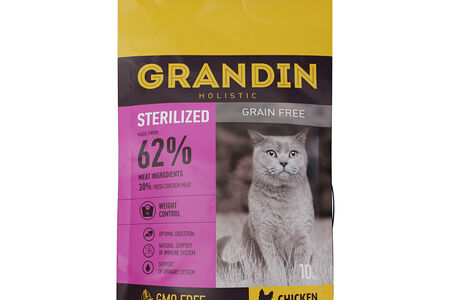Sterilized Grain free Корм Grandin сухой для кастрированных котов и стерилизованных кошек в возрасте от 1 года до 7 лет, с курицей, 10 кг доставка