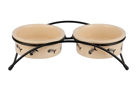 Миска керамическая двойная для кошек на подставке 2х250 мл, бежевая с рыбкой доставка