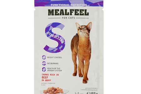 Влажный корм Mealfeel для стерилизованных кошек кусочки с говядиной в соусе для контроля веса доставка