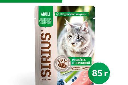 Влажный корм Sirius (пауч) для кошек с чувствительным пищеварением, с индейкой и черникой, 85 гр. доставка