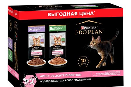 Влажный корм PRO PLAN® Adult DELICATE DIGESTION для взрослых кошек с чувствительным пищеварением или с особыми предпочтениями в еде с индейкой в соусе, с ягненком в соусе 85 г х 10 шт. доставка