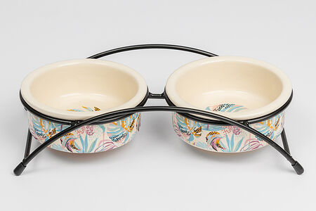 Миска керамическая двойная на подставке для кошек, 2 шт. по 12,5x5 см, c рисунком монстеры доставка