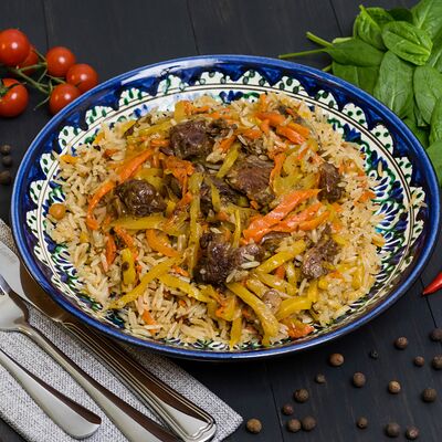 Баранина, морковь, картофель, лук, перец болгарский, бульон