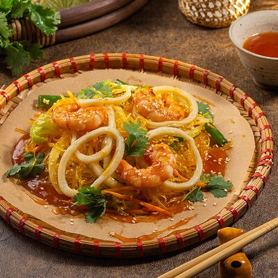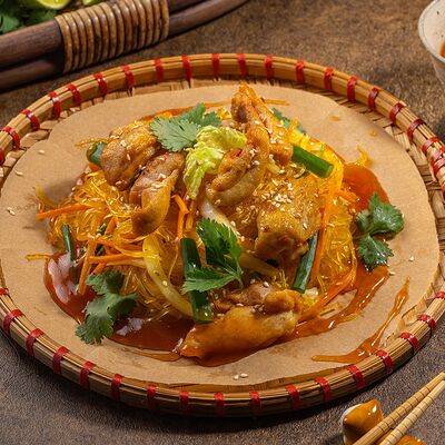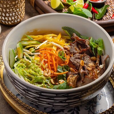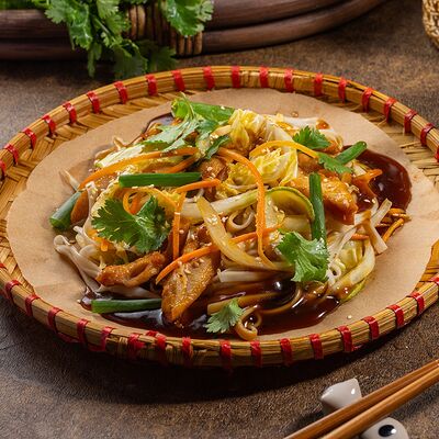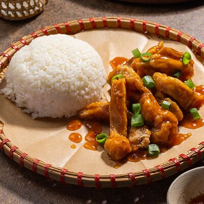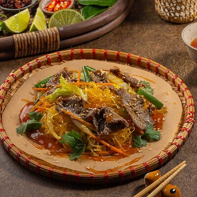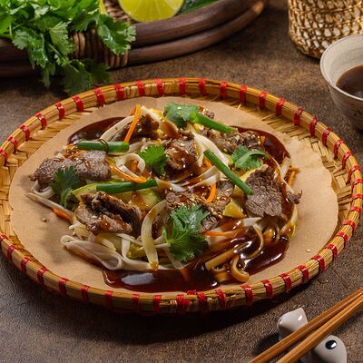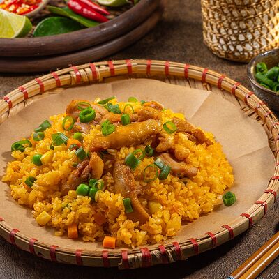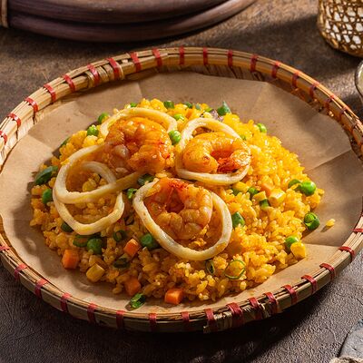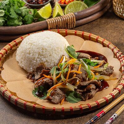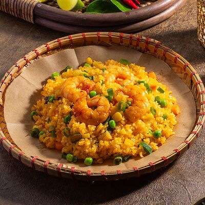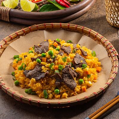 Обжаренный рис с говядиной, яйцо, морковь, кукуруза, горошек, сухой лук