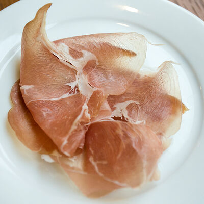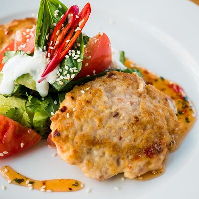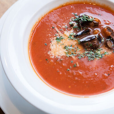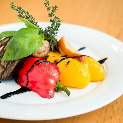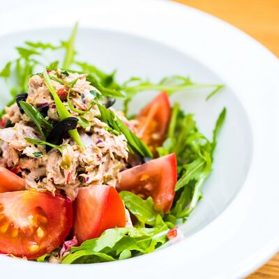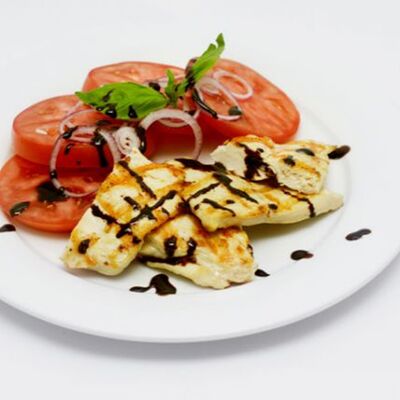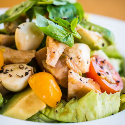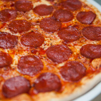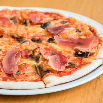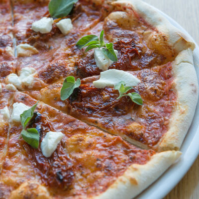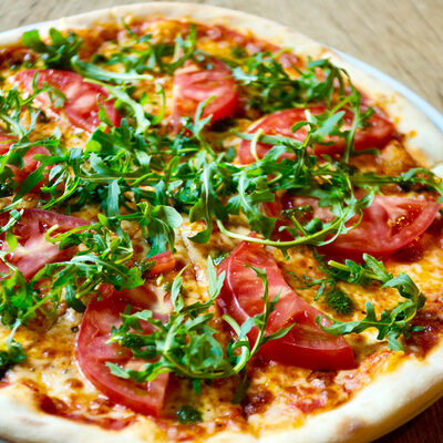 Пицца на тонком тесте с томатным соусом, сыром моцарелла, свежими помидорами, хрустящими листьями рукколы, домашним соусом песто (28 см)