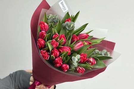 Размер: 35/30 см. Состав: тюльпаны пионовидные , эвкалипт, упаковка. Подарки к каждому букету: открытка, фирменная шоколадка, транспортировочная упаковка, подкормка, инструкция по уходу.