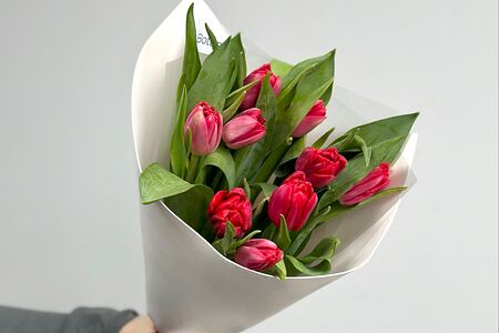 Состав: тюльпаны красные пионовидные, упаковка. Размер: 23/25см. Подарки к каждому букету: открытка, фирменная шоколадка, транспортировочная упаковка, подкормка, инструкция по уходу.