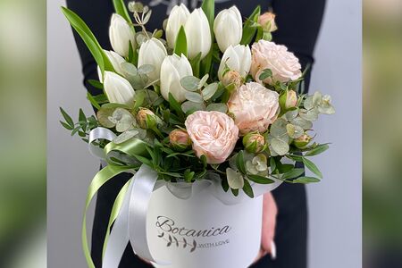 Шляпная коробка с цветами, белыми тюльпанами и кустовой розой. Идеально подойдет маме, коллеге или любимой. К каждому букету бесплатно прилагается: открытка с вашими пожеланиями, подкормка для продления жизни цветка, фирменная транспортировочная упаковка