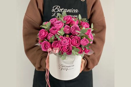 Коробка с кустовыми розами "Мисти Баблс" и эвкалиптом. доставка