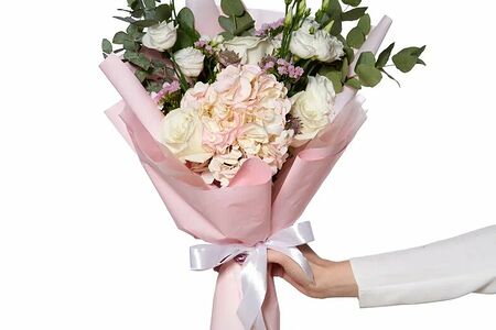 3 астрации,1 гортензия,1 эустома,3 розы сорта плая бланка,1 статица,эвкалипт,флокс