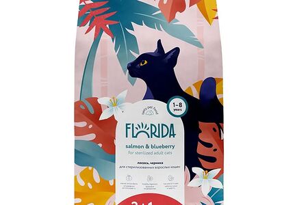 Полнорационные корма FLORIDA для яркой и здоровой жизни вашего питомца!Florida Salmon & Blueberry - сухой корм супер-премиум-класса с лососем и черникой для стерилизованных кошек в возрасте от 1 до 8 лет. Сбалансированное полнорационное питание заботится о коже и шерсти и способствует здоровому пищеварению. В рационе кормов Florida используется только белок животного происхождения. Преимущества корма:○ Полнорационные корма FLORIDA для яркой и здоровой жизни вашего питомца! Натуральные антиоксиданты - ягоды, фрукты.○ Поддержка опорно-двигательной системы - глюкозамин, хондроитин.○ Поддержка работы сердечно-сосудистой системы, зрения - таурин.○ Здоровое пищеварение - свекла, морковь, дрожжи.○ Натуральные источники Омега 3 и 6 кислот, забота о шерсти и коже -семена льна, куриный жир, рыбий жир.
