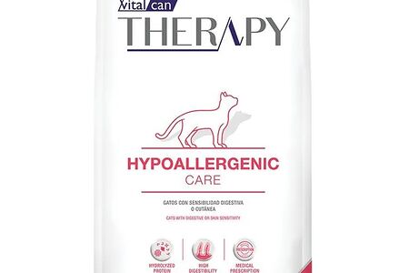 Vitalcan Therapy Feline Hypoallergenic Care - полнорационный корм для кошек с признаками пищевой непереносимости и пищевой аллергии. Для лечения данных заболеваний диета содержит гидролизат белка с низкой молекулярной массой и специально подобранные углеводы. • Гидролизат белка: низкая молекулярная масса гидролизованных белков помогает контролировать аллергию. • Высокая усвояемость: в составе формулы корма легко усваиваемые углеводы, такие как картофельный крахмал и крахмал из тапиоки, они быстро всасываются и обеспечивают восстановление чувствительного кишечника. • Омега-3: высокая концентрация Омега-3 улучшает состояние слизистой оболочки кишечника и кожи.