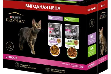 Влажный корм PRO PLAN® Adult DELICATE DIGESTION для взрослых кошек с чувствительным пищеварением или с особыми предпочтениями в еде с индейкой в соусе, с ягненком в соусе 85 г х 10 шт. доставка